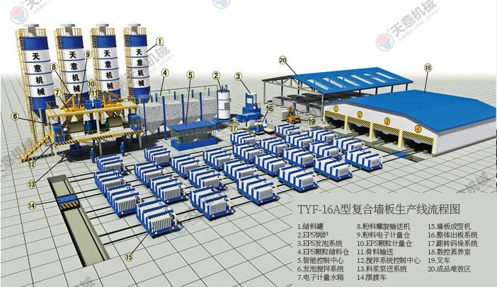 TYF-16A型復(fù)合墻板生產(chǎn)線是公司綜合國內(nèi)外技術(shù)經(jīng)驗,開發(fā)研制的新型墻體板材生產(chǎn)線。復(fù)合墻板生產(chǎn)線主要分為配料系統(tǒng)、攪拌系統(tǒng)、發(fā)泡系統(tǒng)、數(shù)控配電系統(tǒng)、墻板成型系統(tǒng)、料漿泵送系統(tǒng)、EPS預(yù)發(fā)系統(tǒng)、液壓循環(huán)系統(tǒng)、整體出板系統(tǒng)。