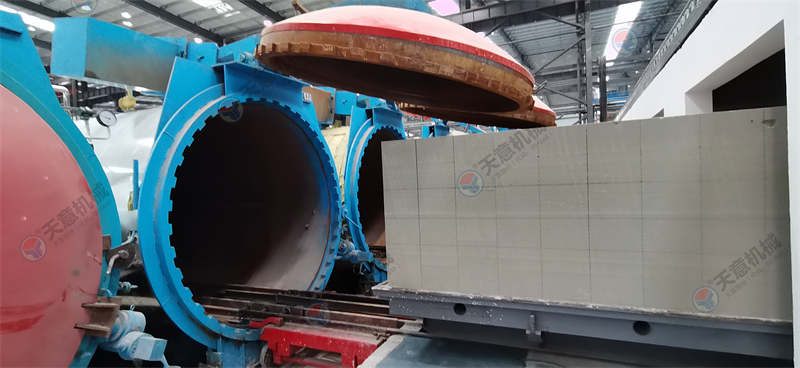 蒸壓養(yǎng)護(hù)是對(duì)加氣混凝土坯體進(jìn)行高壓蒸汽養(yǎng)護(hù),對(duì)加氣混凝土而言,只有經(jīng)過(guò)一定的溫度和足夠時(shí)間的養(yǎng)護(hù),坯體才能完成必要的物理化學(xué)變化,從而達(dá)到滿足建筑施工的強(qiáng)度需要。 蒸壓養(yǎng)護(hù)工序決定了加氣混凝土內(nèi)在性能的最后形成。 裝入蒸養(yǎng)釜: 養(yǎng)護(hù)車上坯體被運(yùn)至蒸養(yǎng)釜, 在釜中受到高壓蒸汽的養(yǎng)護(hù)